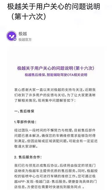 据集度官网6月13日发布的公告,关于极越的售后服务,由吉利旗下领克全面承接车辆维保,此外,极越授权的钣喷中心也可以进行车辆维修。