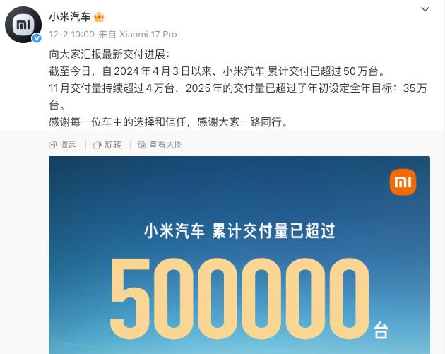 根据官方的数据显示,从 2024 年 4 月至今,小米汽车已累计交付超 50 万台;