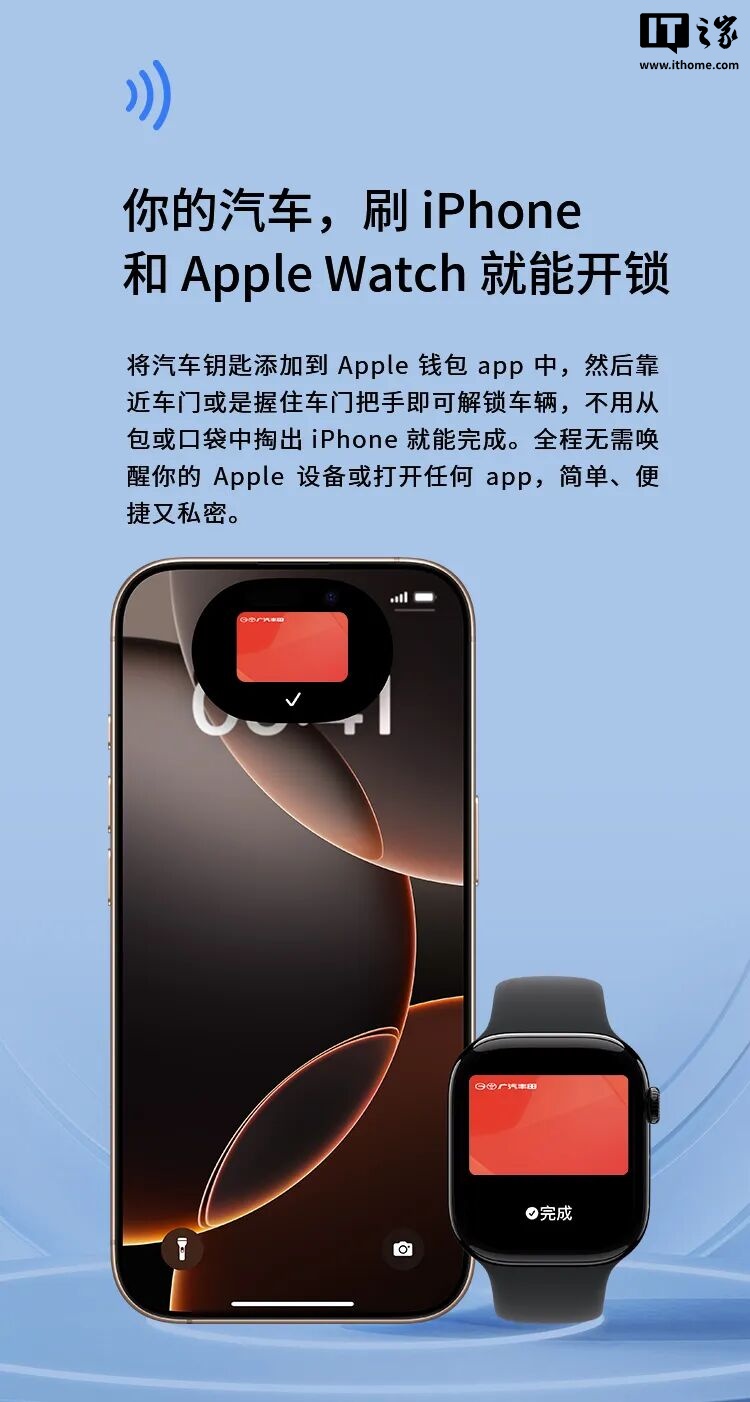 IT之家 12 月 10 日消息,广汽丰田今日宣布,全新换代威兰达汽车搭载新一代数字钥匙,支持 iPhone / Apple Watch 解锁车辆。