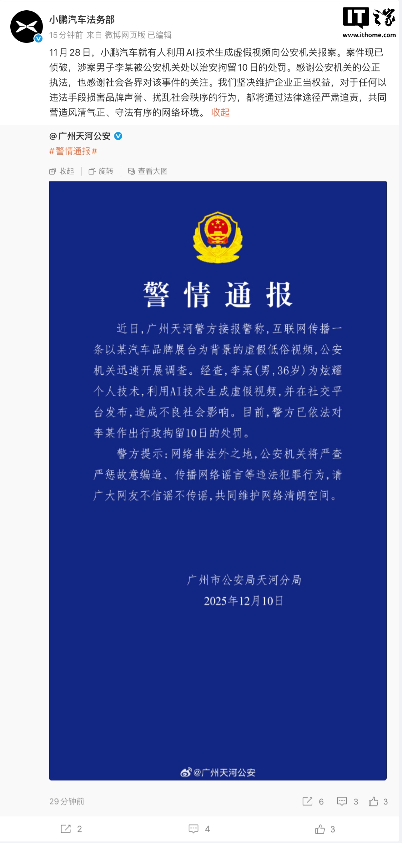 IT之家 12 月 10 日消息,小鹏汽车法务部今日发文称:11 月 28 日,小鹏汽车就有人利用 AI 技术生成虚假视频向公安机关报案。广州市公安局天河分局 12 月 10 日通报,经查,李某(男,36 岁)为炫耀个人技术,利用 AI 技术生成虚假视频,并在社交平台发布,造成不良社会影响。目前,警方已依法对李某作出行政拘留 10 日的处罚。