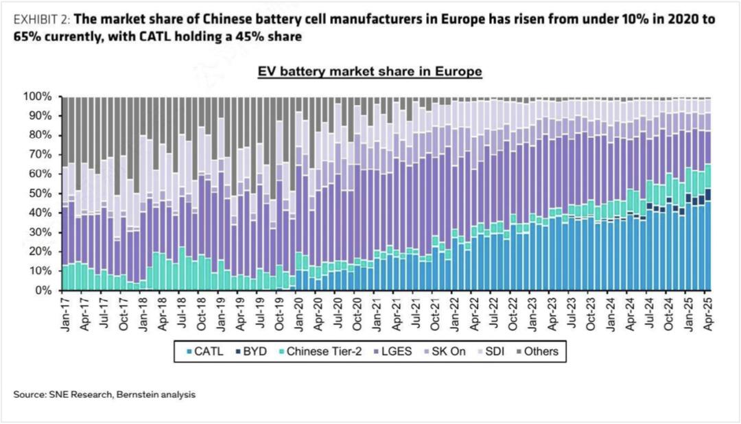 中国电池企业在欧洲份额从2020年<10%升至当前65%,宁德时代占45%