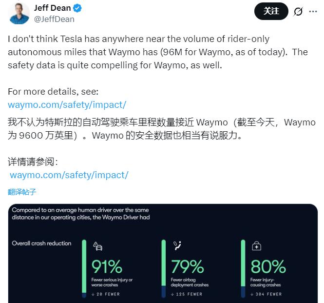 杰夫在帖子里强调的“领先”,更侧重纯无人里程数和安全性。
