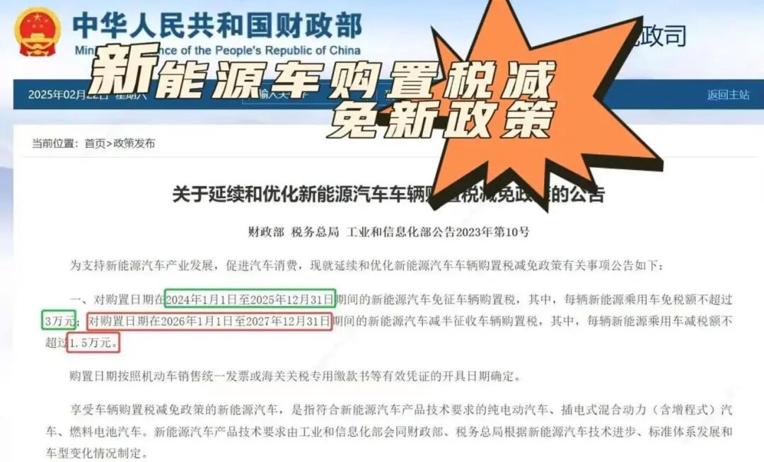 这是自新能源汽车购置税优惠政策实施以来,首次从全额免征转为减半征收。根据新规,购买符合条件的新能源汽车可享受车辆购置税减半征收,有效期至2027年底,计算方式为“车辆不含税售价×5%”,单辆车最高减免1.5万元。