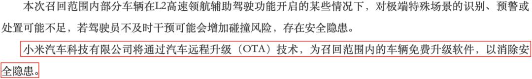 小米SU7标准版的车主收到的是软件升级方案,官方称可通过OTA远程修复辅助驾驶系统的安全隐患。