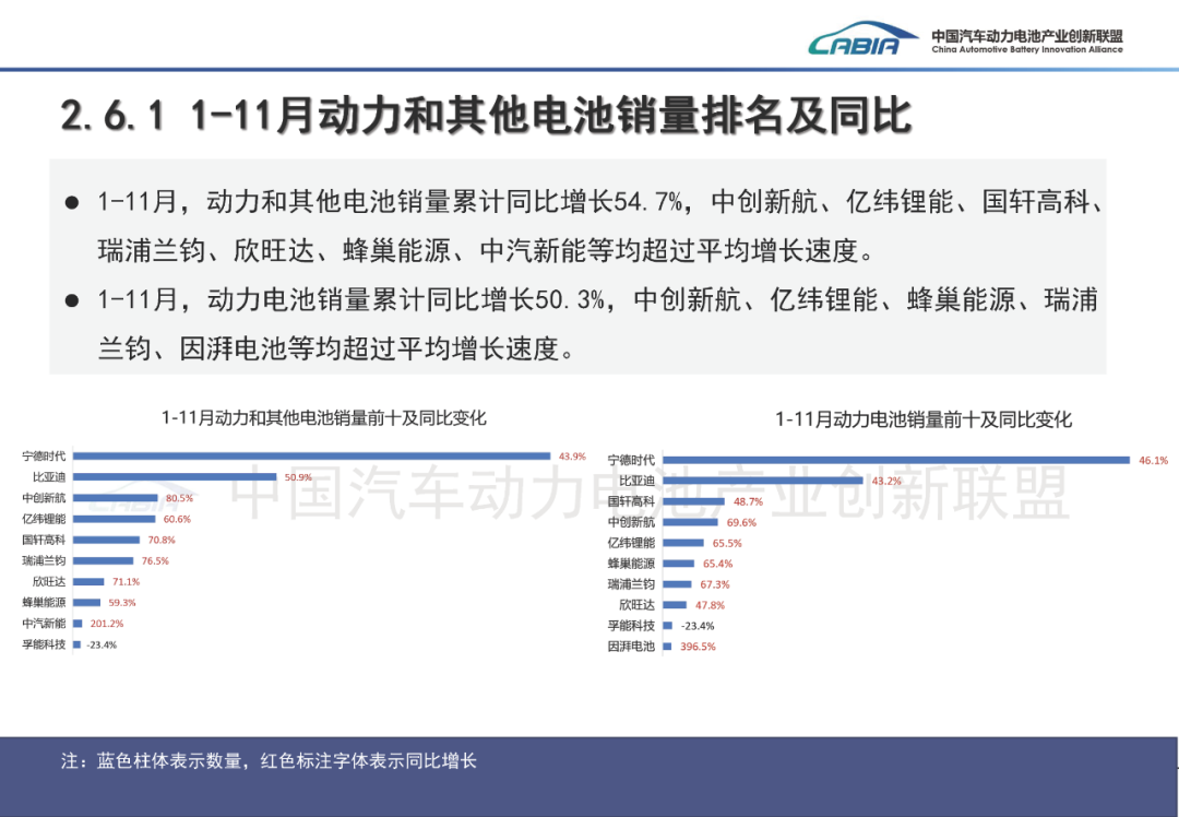 IT之家从数据中获悉,11 月我国动力和其他电池销量为 179.4GWh,环比增长 8.1%,同比增长 52.2%。其中,动力电池销量为 134.0GWh,占总销量 74.7%,环比增长 7.8%,同比增长 52.7%;其他电池销量为 45.4GWh,占总销量 25.3%,环比增长 8.9%,同比增长 50.7%。