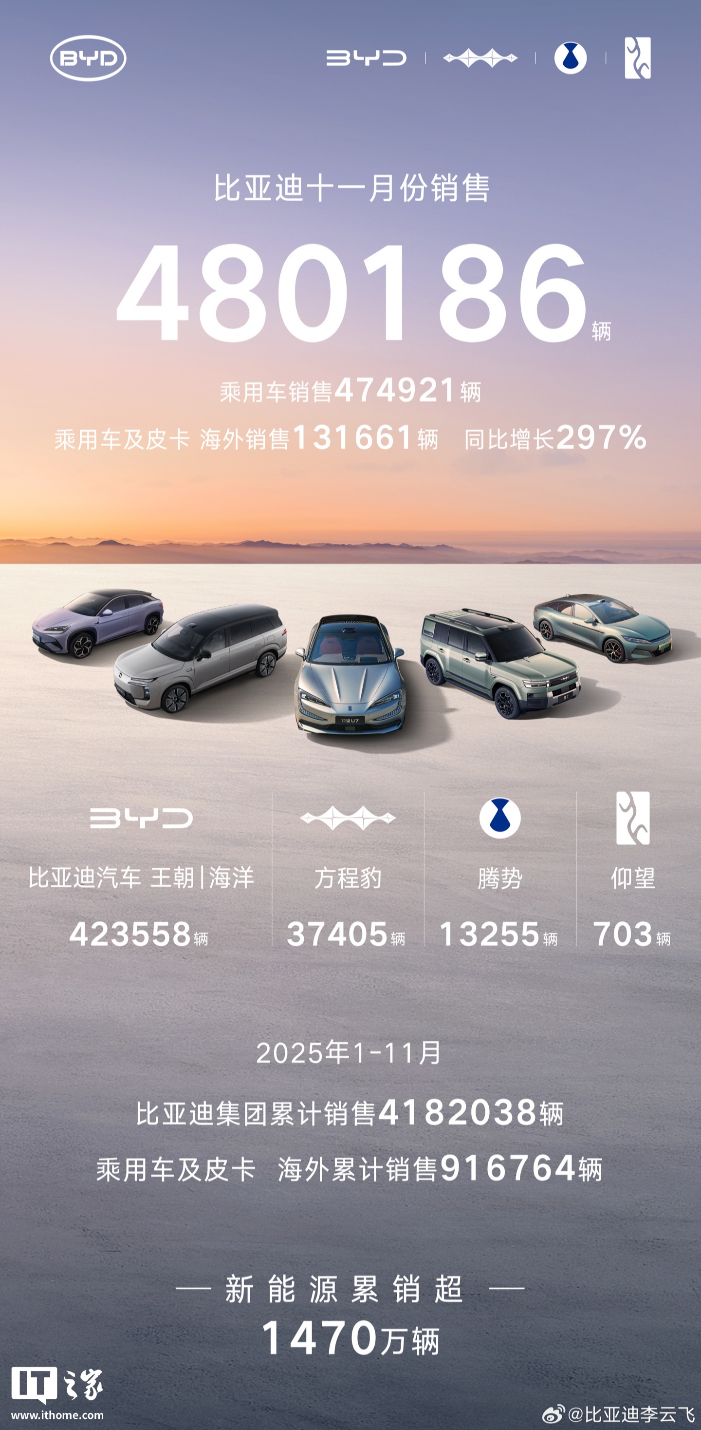 今年 11 月,比亚迪汽车销量 480186 辆(去年同期 506804 辆)。今年 1-11 月,汽车销量 418 万辆,同比增长 11.3%。公司 2025 年 11 月新能源汽车动力电池及储能电池装机总量约为 27.669GWh,2025 年累计装机总量约为 258.282GWh。