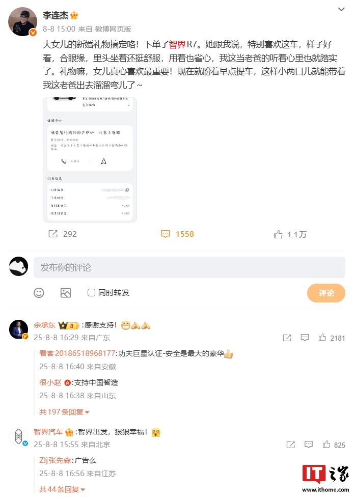 值得一提的是,李连杰还在今年 8 月宣布给自己大女儿下单智界 R7 作为新婚礼物。