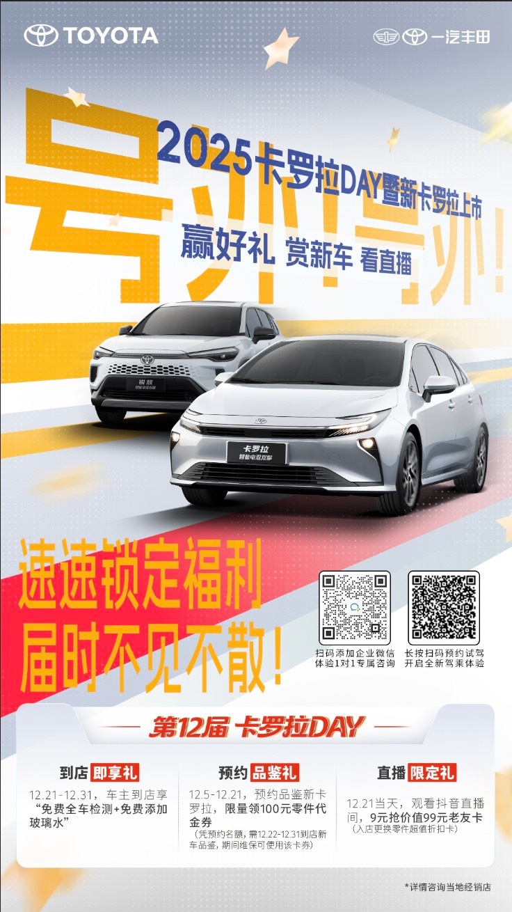 IT之家 12 月 16 日消息,一汽丰田全新卡罗拉宣布将于 12 月 21 日举办的 COROLLA DAY——2025 卡罗拉车主狂欢节期间正式上市。