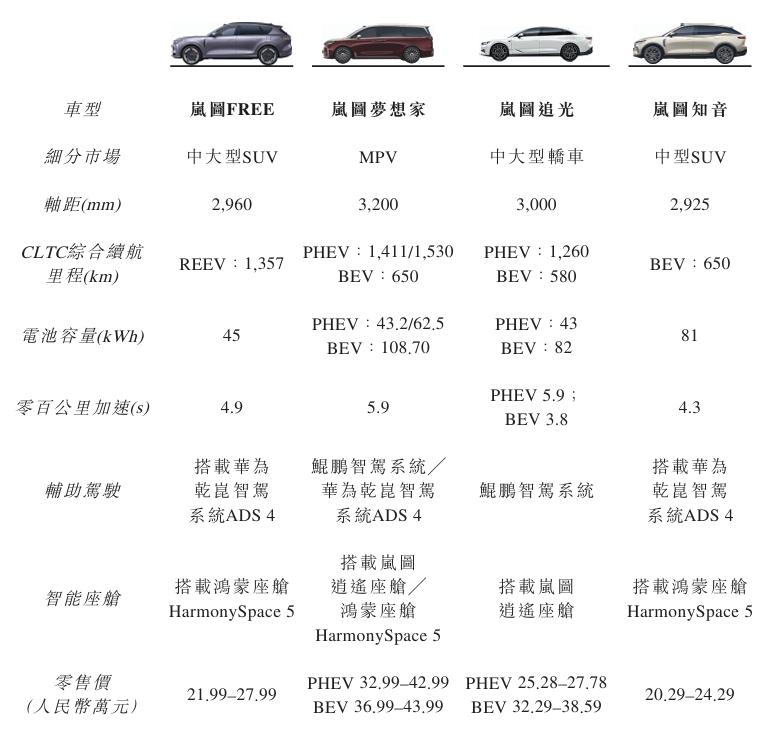 岚图汽车的产品覆盖轿车、SUV及MPV三大细分市场。自成立以来,公司推出了四款车型系列,即中大型SUV岚图FREE系列、MPV岚图梦想家系列、中大型轿车岚图追光系列和中型SUV岚图知音系列。