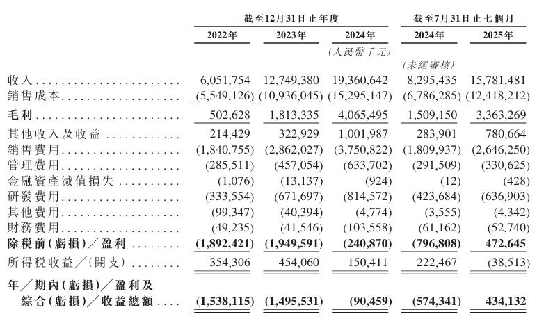 招股书显示,2022年-2024年,公司收入从60.52亿元增至193.61亿元,复合年增长率78.9%,这一增长水平,在15强中国高端新能源车企中排名第三。今年前7个月,公司已实现收入157.82亿元,同比增长90.2%。