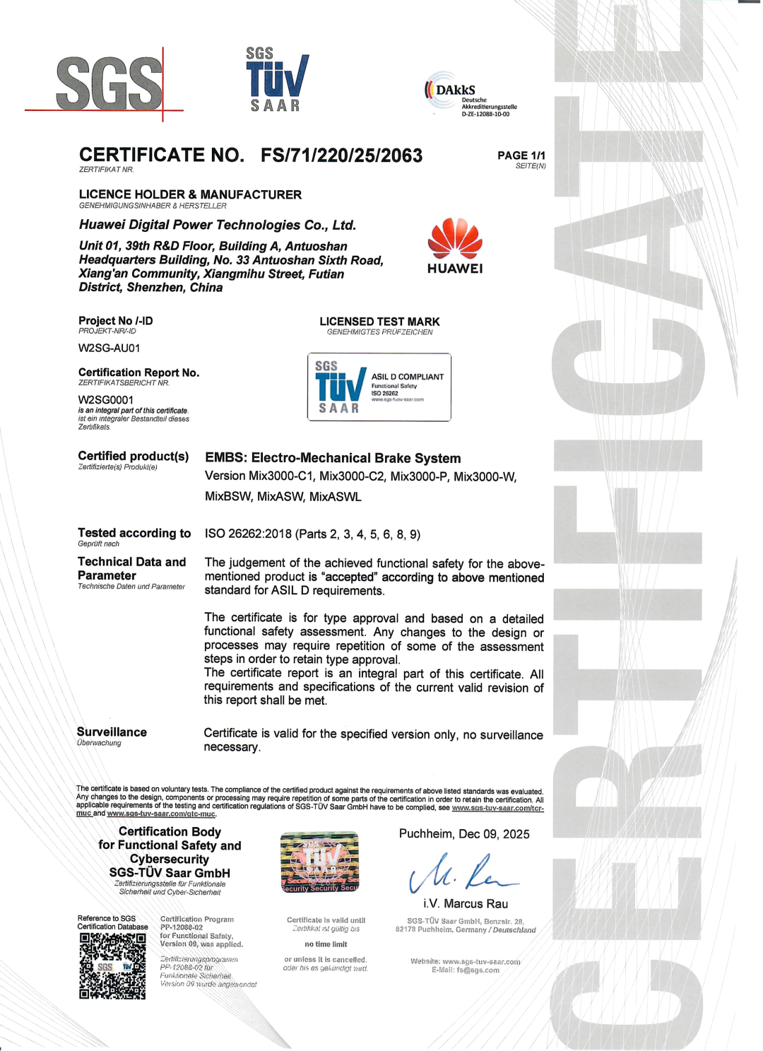 IT之家 12 月 16 日消息,华为数字能源今日宣布,国际权威认证机构 SGS 通标标准技术服务有限公司正式向华为颁发融合驱动全球首个 ISO 26262 DAkkS ASIL D 等级认证证书。