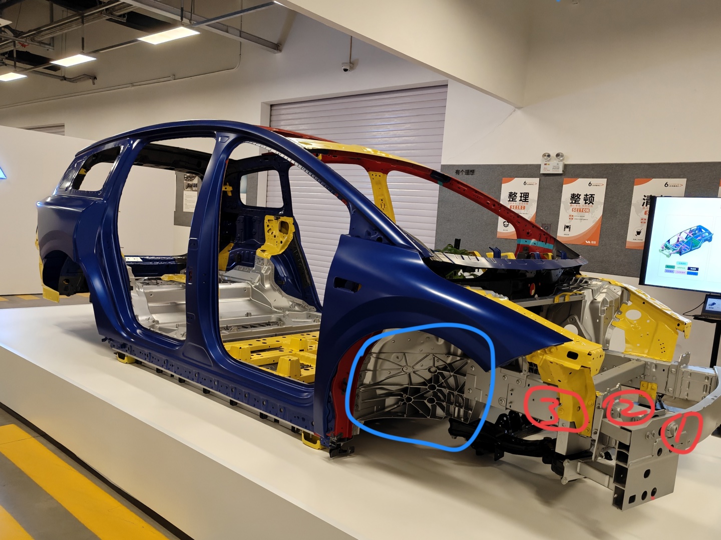 图 1,图 2 是理想 i8 的后部和前部车体(手机标记,凑合看),蓝色的圈是一体压铸结构,红色标记的 1.2.3 的那个是铝合金防撞梁、铝合金吸能盒、铝合金纵梁。