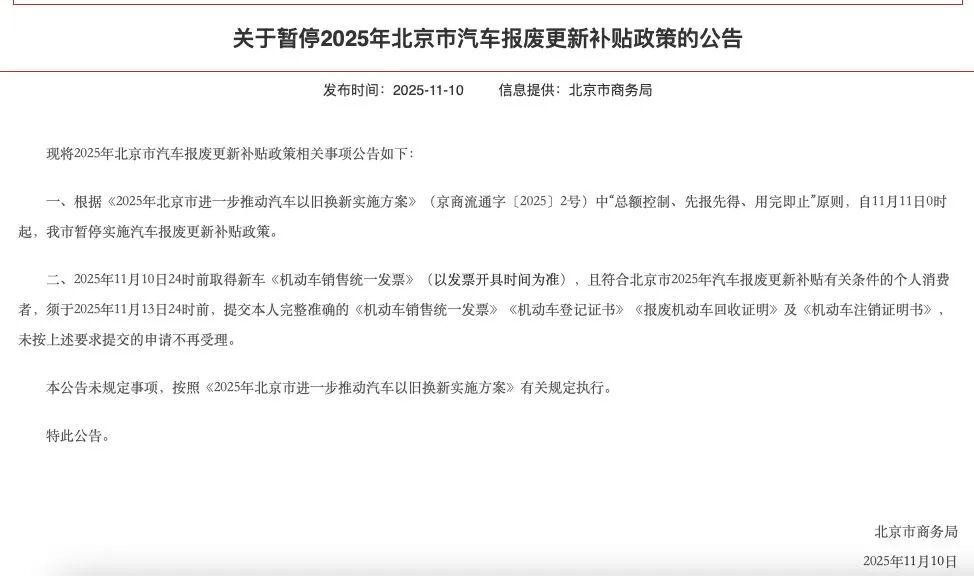 11月12日,北京市商务局发布《关于暂停2025年北京市汽车报废更新补贴政策的公告》称,根据“总额控制、先报先得、用完即止”原则,自11月11日0时起,北京市暂停实施汽车报废更新补贴政策。“北京市已经暂停的地方补贴和明年1月执行的新能源汽车购置税金额其实差不多。”一位蔚来中心(东方广场)销售人员对记者说。