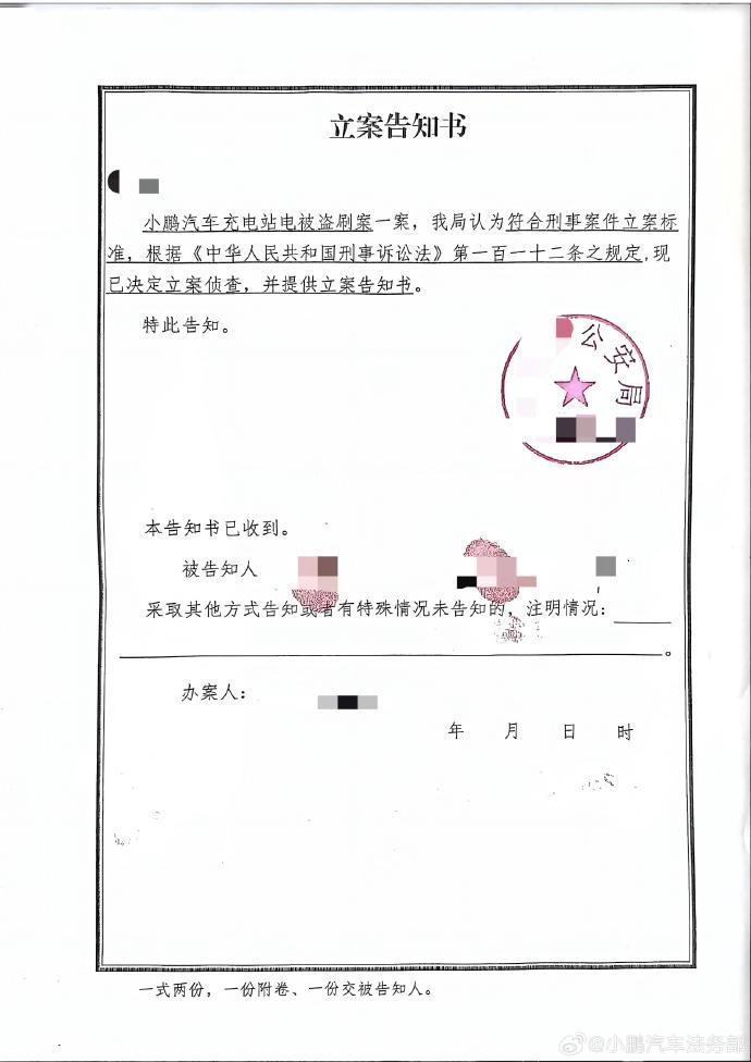 公布的案件文书显示:小鹏汽车充电站电被盗刷一案,符合刑事案件立案标准。经过侦查,该案嫌疑人已经到案,主要犯罪事实已经固定,案件已侦破。