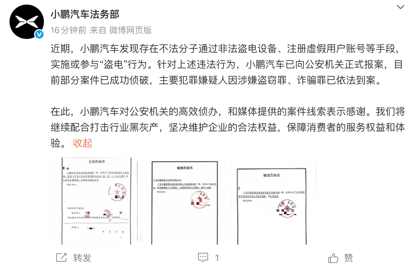 凤凰网科技讯 12月18日,小鹏汽车法务部发文称,近期,小鹏汽车发现存在不法分子通过非法盗电设备、注册虚假用户账号等手段,实施或参与“盗电”行为。针对上述违法行为,小鹏汽车已向公安机关正式报案,目前部分案件已成功侦破,主要犯罪嫌疑人因涉嫌盗窃罪、诈骗罪已依法到案。