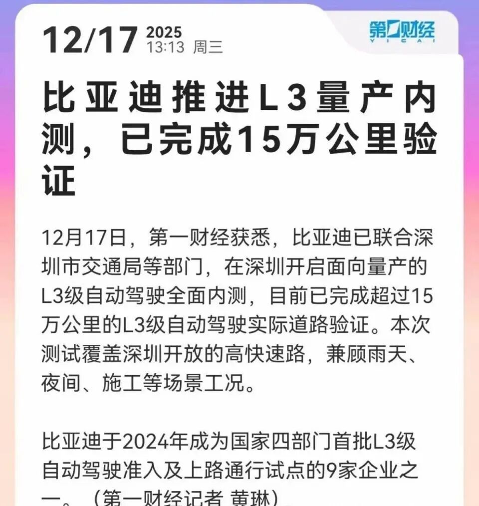 作为首批获批的9家能搞L3准入试点的企业之一,比亚迪最近也是有了实打实的进展,其已在深圳开启面向量产的L3全面内测,已经跑了超15万公里真实道路,覆盖了深圳开放的高快速路,还特意挑了雨天、夜间、施工路段这些复杂情况来考验系统。