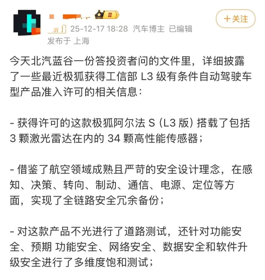北汽集团已经明确,虽然现在仅极狐阿尔法S(L3版)车型一款获批,但后续会逐步扩大L3产品覆盖范围,计划2026年一季度以特定场景启动运营。
