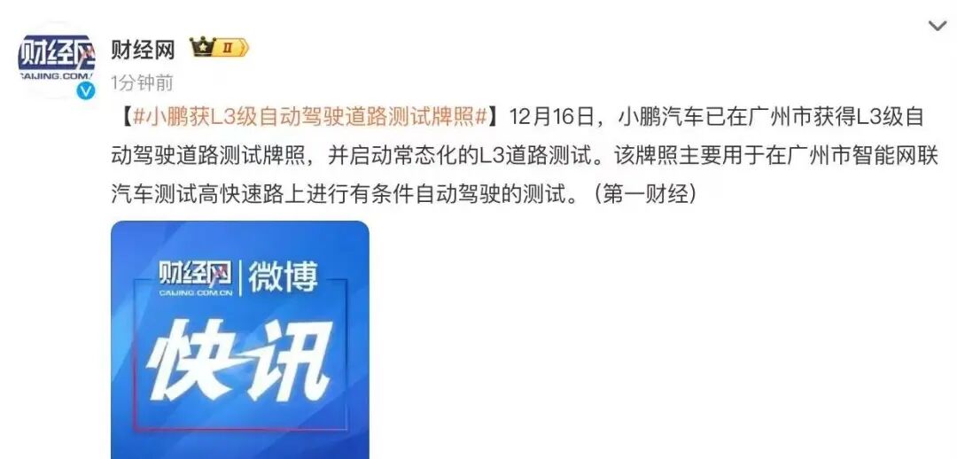 转天,新势力车企和科技巨头也全都跟上了。12月16日,小鹏被曝已经拿到了广州的L3道路测试牌照。