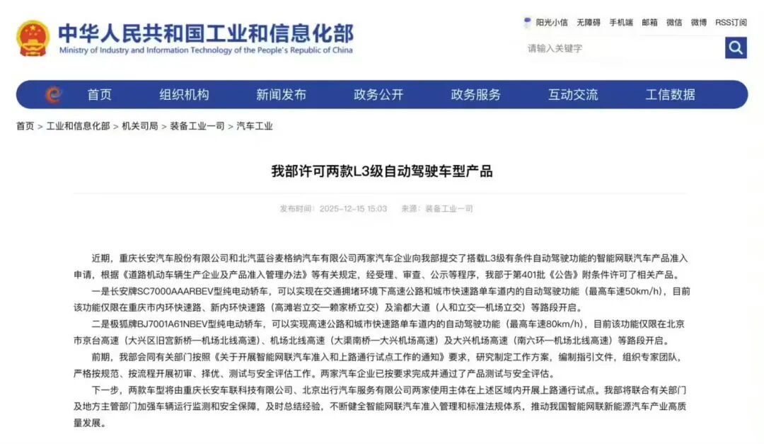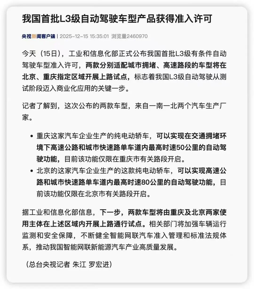 最近,国内汽车圈被一则重磅消息点燃了——工业和信息化部正式公布我国首批L3级有条件自动驾驶车型准入许可。