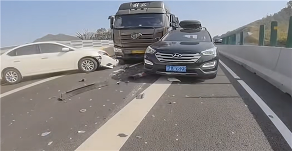 慢车道内一辆正常行驶的重型半挂车紧急刹车,但还是撞上了万某的车,并与快车道一辆紧急刹车的黑色小车发生碰撞。