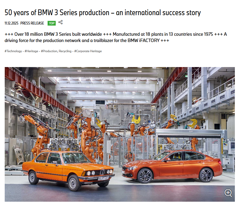 无论美国斯帕坦堡工厂、德国莱比锡工厂、墨西哥圣路易斯波托西工厂,还是中国的华晨宝马合资企业,均以宝马 3 系作为首款投产车型。数十年来,宝马 3 系的多款衍生车型 —— 涵盖四门轿车、敞篷轿跑、旅行版及 M 高性能版本 —— 凭借高度柔性化的生产体系,在集团旗下几乎所有工厂实现投产。包括燃油车、插电式混合动力车及纯电动车在内的多种动力车型,均可在同一条生产线完成组装。