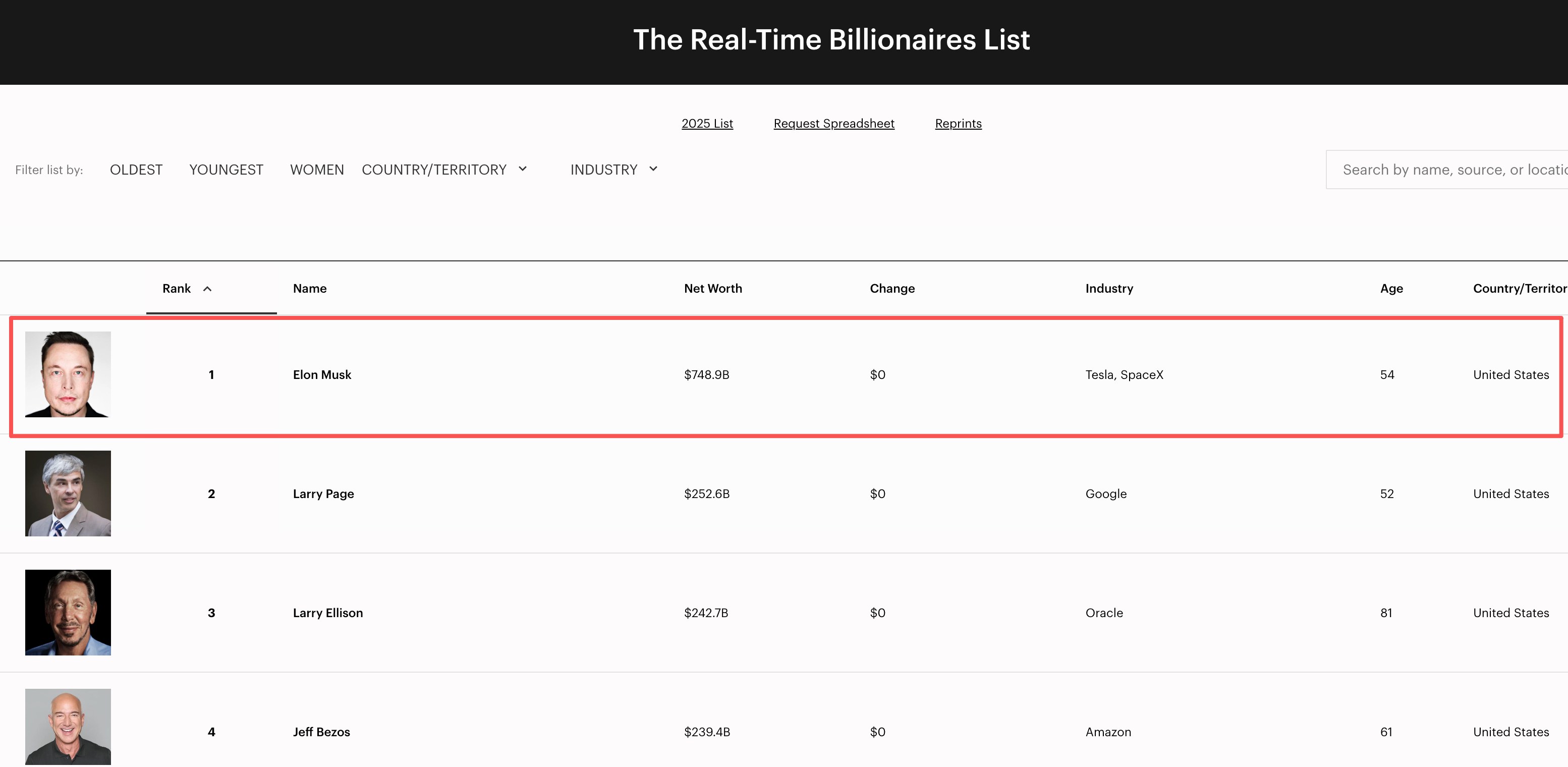 《福布斯》实时亿万富翁榜单显示,马斯克现在的净资产达到7489亿美元,牢牢占据世界首富位置。谷歌联合创始人拉里·佩奇(Larry Page)排在第二,净资产为2526亿美元,落后近5000亿美元。