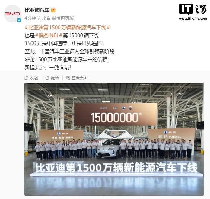 据IT之家此前报道,比亚迪官方在 12 月 18 日宣布,比亚迪第 1500 万辆新能源汽车下线,也是腾势 N8L 第 15000 辆下线。比亚迪今年前 11 月累计销量达 418 万辆,同比增长 11.3%。其中,海洋网今年前 11 月累计销量达 203 万辆,同比增长 17.9%。