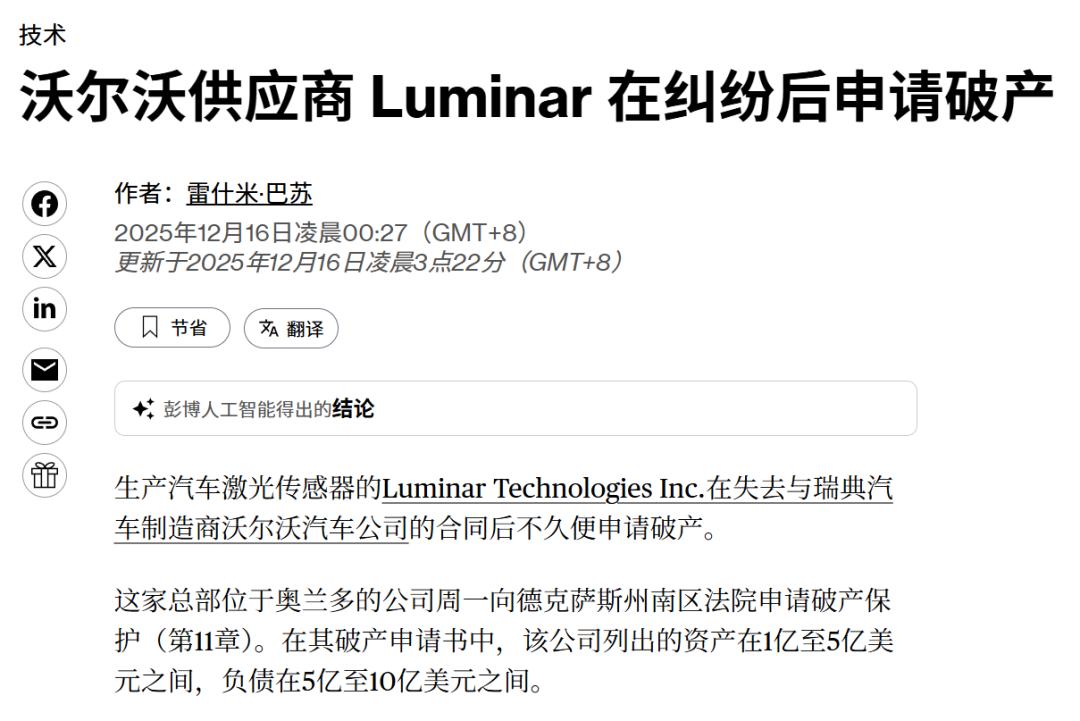 到今年,沃尔沃就以 “ Luminar 未履行合同义务,供应链风险过高 ” 为由,直接断了合同。那 Luminar 本来也就没啥市场,全靠大哥一口气吊着,妹有大哥罩着,我就只能死给你看了。。。