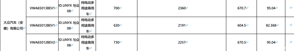 IT之家 12 月 22 日消息,《减免车辆购置税的新能源汽车车型目录》(第二十四批)公布了大众安徽旗下的与众 08 的电池动力信息,该车定位纯电动中大型 SUV,配备 800V 超快充以及 L2++ 级辅助驾驶系统,并支持整车 OTA 升级。