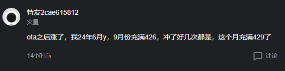 有车主称 OTA 之后 2024 年 6 月产的 Model Y 也涨了,9 月份充满是 426,冲了好几次都是,这个月充满变 429 公里了。
