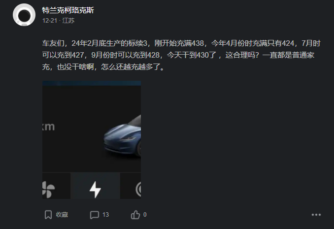 日前,有车主@特兰克柯珞克斯求证称,自己 2024 年 2 月底生产的 Model 标续版,刚开始充满表显是 438 公里,今年 4 月份时充满只有 424,7 月时可以充到 427,9 月份时可以充到 428,今天干到 430 了,这合理吗?一直都是普通家充,也没干啥啊,怎么还越充越多了。