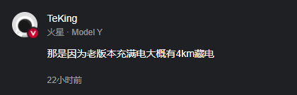 有 Model Y 车主表示,那是因为老版本充满电大概有 4km 藏电。