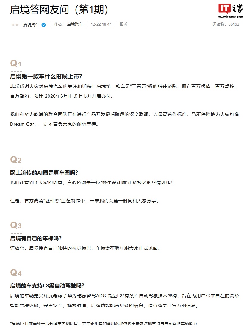 IT之家 12 月 22 日消息,启境汽车官方微博今日发布答网友问(第 1 期),针对首车上市时间、网上流传的 AI 图是否为真车图、品牌有无自己的车标、是否支持 L3 自动驾驶等问题进行了解答。