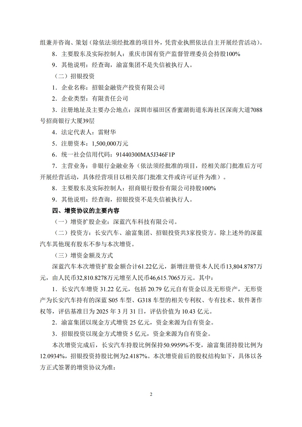 本次增资完成后,长安汽车持股比例保持 50.9959% 不变,渝富集团持股比例为 12.0934%,招银投资持股比例为 2.4187%。