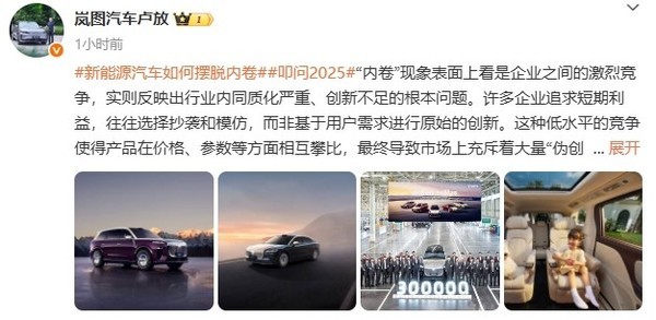 【CNMO科技消息】近日,岚图汽车董事长卢放就新能源汽车行业如何摆脱“内卷”发表长文,直指当前行业竞争的根本问题在于同质化严重与创新不足。他批评许多企业为追求短期利益,往往选择抄袭和模仿,而非基于用户需求进行原始创新。