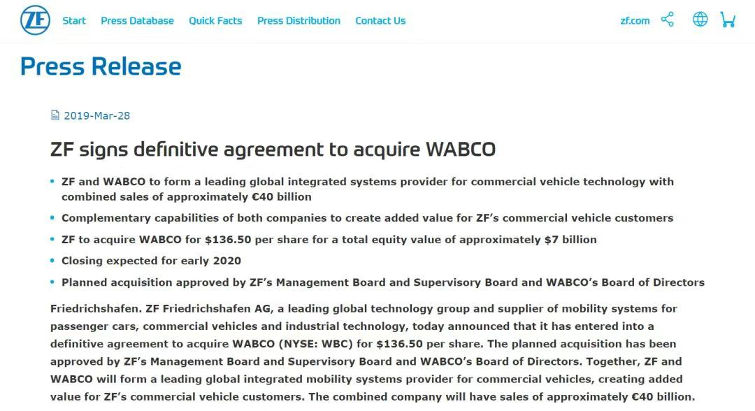 很大程度上源于过去的两次大规模并购,2015年,采埃孚以129亿美元收购美国大型汽车零部件供应商天合汽车集团TRW Automotive,2019年又砸超过70亿美元拿下美国竞争对手Wabco(威伯科),以增强其在卡车和驾驶员辅助系统方面的市场份额。