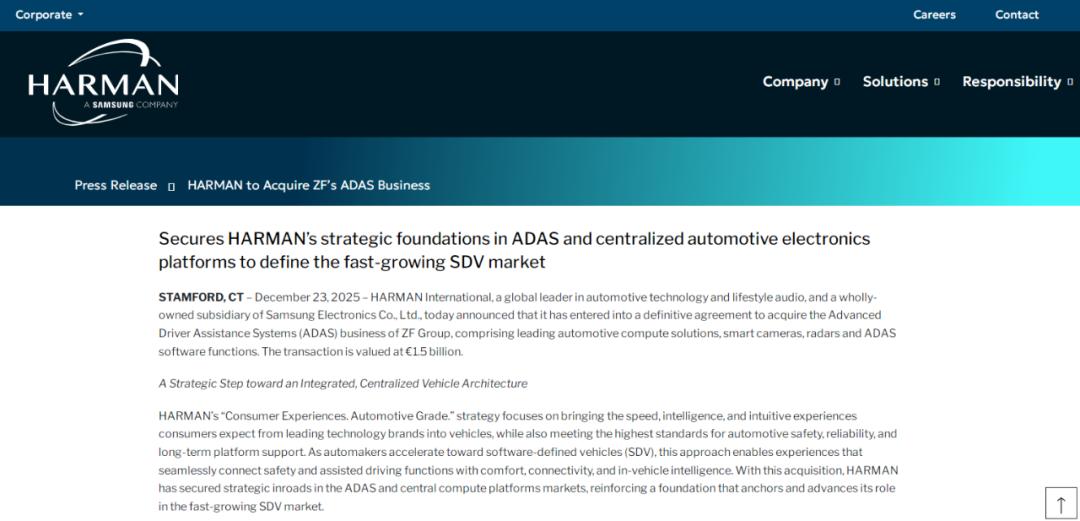 汽车音响制造商——哈曼集团宣布,已与采埃孚集团达成最终协议,收购采埃孚的高级驾驶辅助系统(ADAS)业务,交易估值达15亿欧元(约合人民币124亿)。