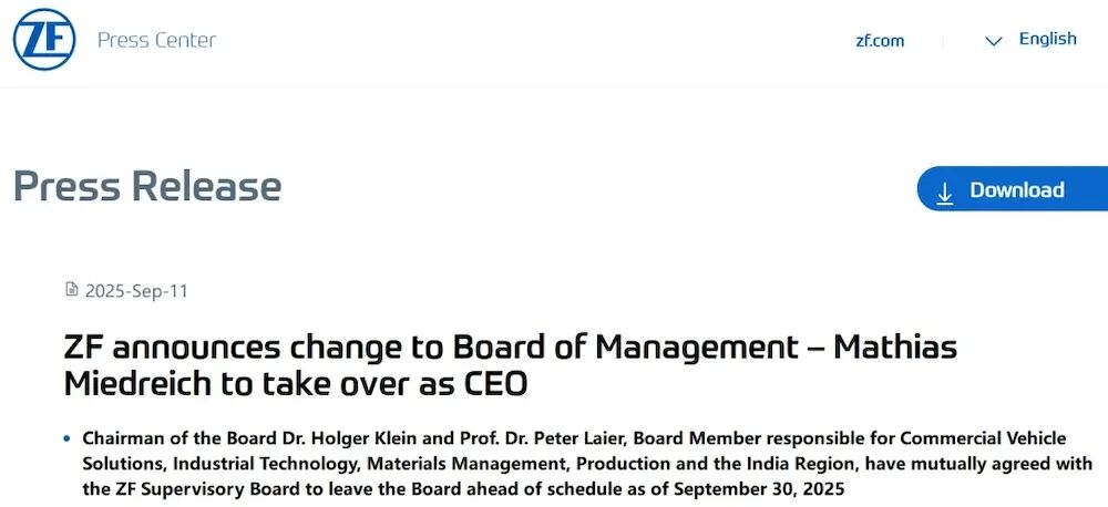 受此事件影响,今年9月11日,采埃孚官宣,采埃孚原董事长兼CEO柯皓哲于当月提前结束任期,离开董事会。继任者为电驱传动技术事业部负责人马蒂亚斯·米德莱希。与此同时,采埃孚商用车解决方案事业部负责人彼得·莱尔(Peter Laier)也被踢出了董事会。
