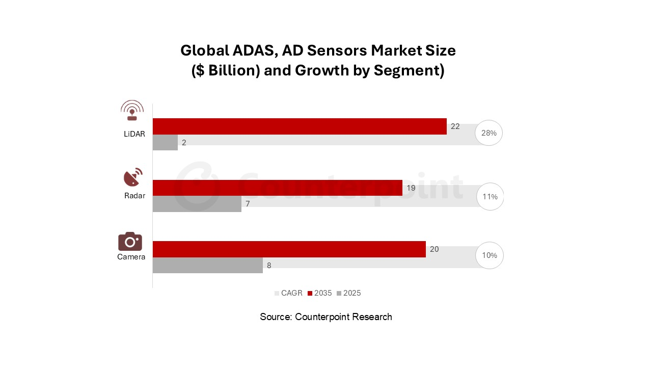 近日,市调机构Counterpoint Research在报告中指出,到2035年,全球高级驾驶辅助系统(ADAS)和自动驾驶(AD)传感器市场预计将达到 610 亿美元。