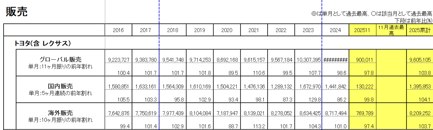 IT之家 12 月 25 日消息,丰田汽车今日公布 2025 年 11 月全球销量(含雷克萨斯,下同)为 900011 辆,同比下降 2%,为 11 个月来首次转为下降。