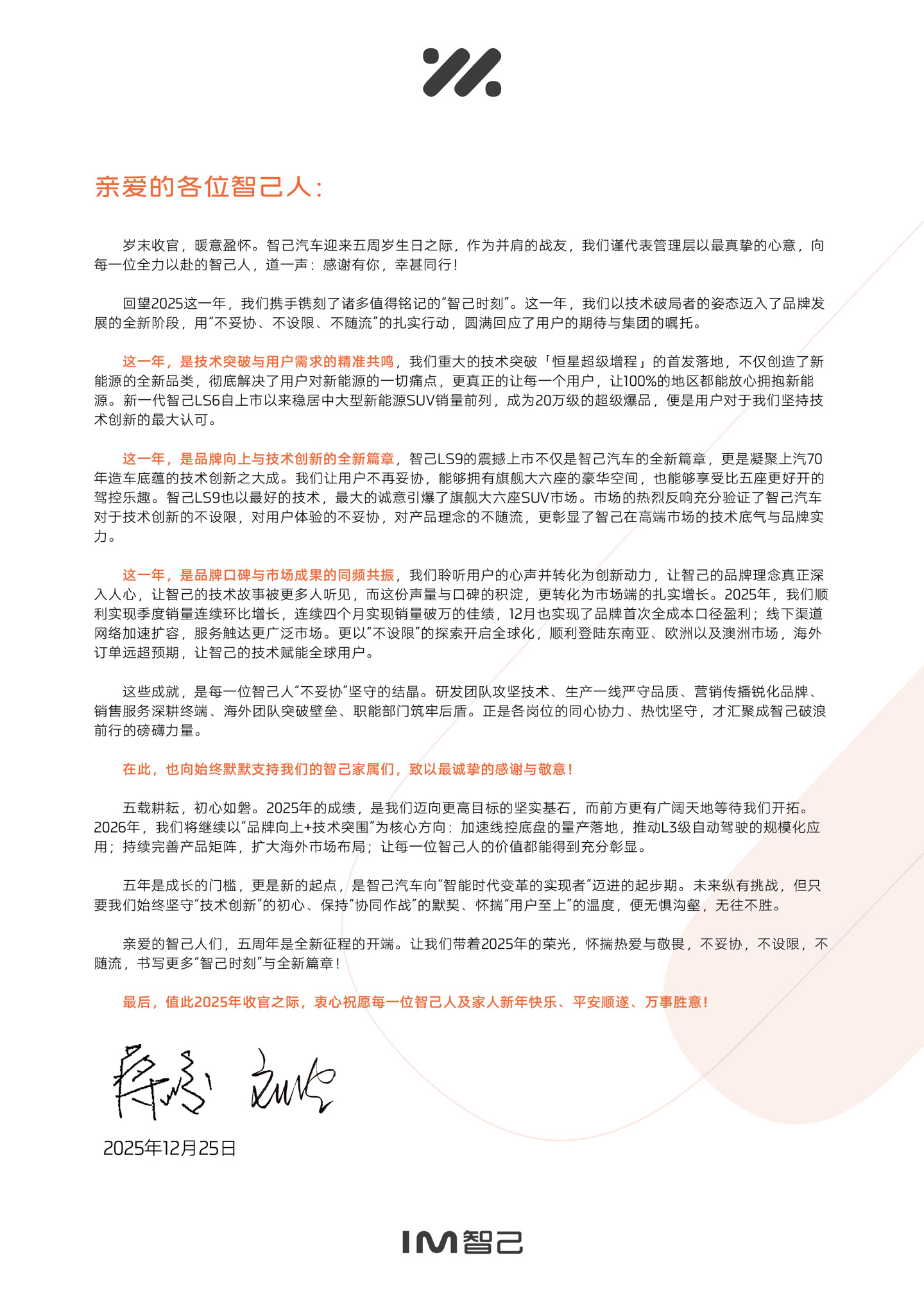 IT之家 12 月 25 日消息,智己汽车今日迎来成立五周年,官方发布了致全体员工的内部信,借此回顾 2025 年的发展成果与 2026 年的规划。