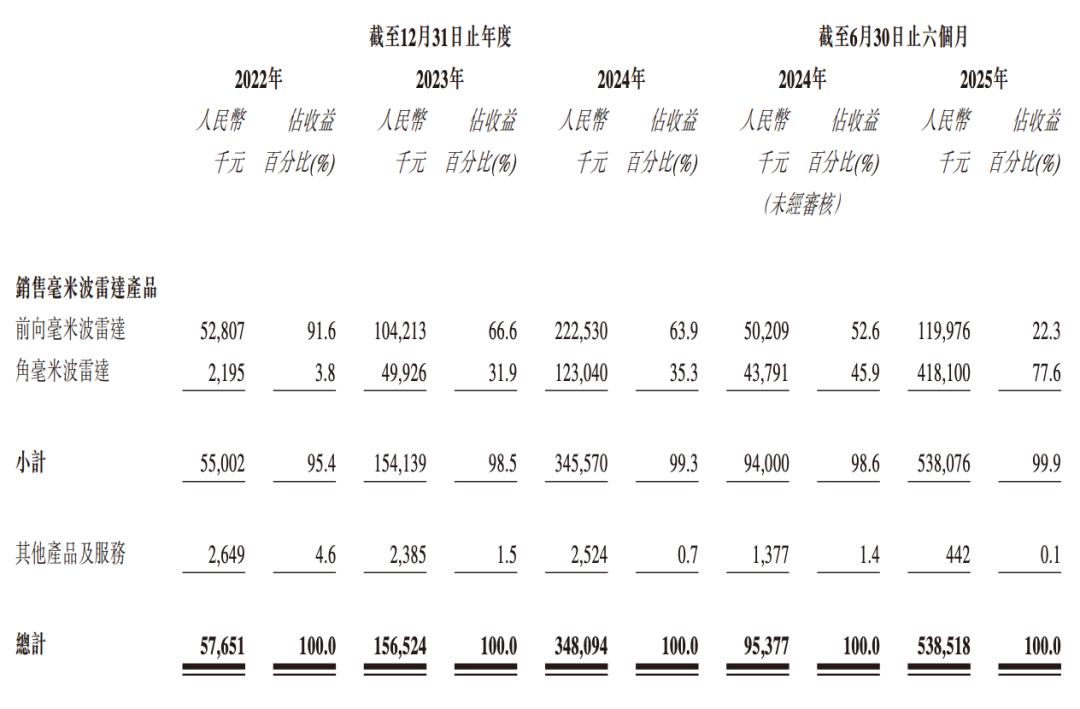 承泰科技目前主要收益来自向OEM销售已商品化的毫米波雷达产品,其中前向毫米波雷达占比较大。但2025年上半年,这一情况发生了逆转,角毫米波雷达营收占比来到77.6%。
