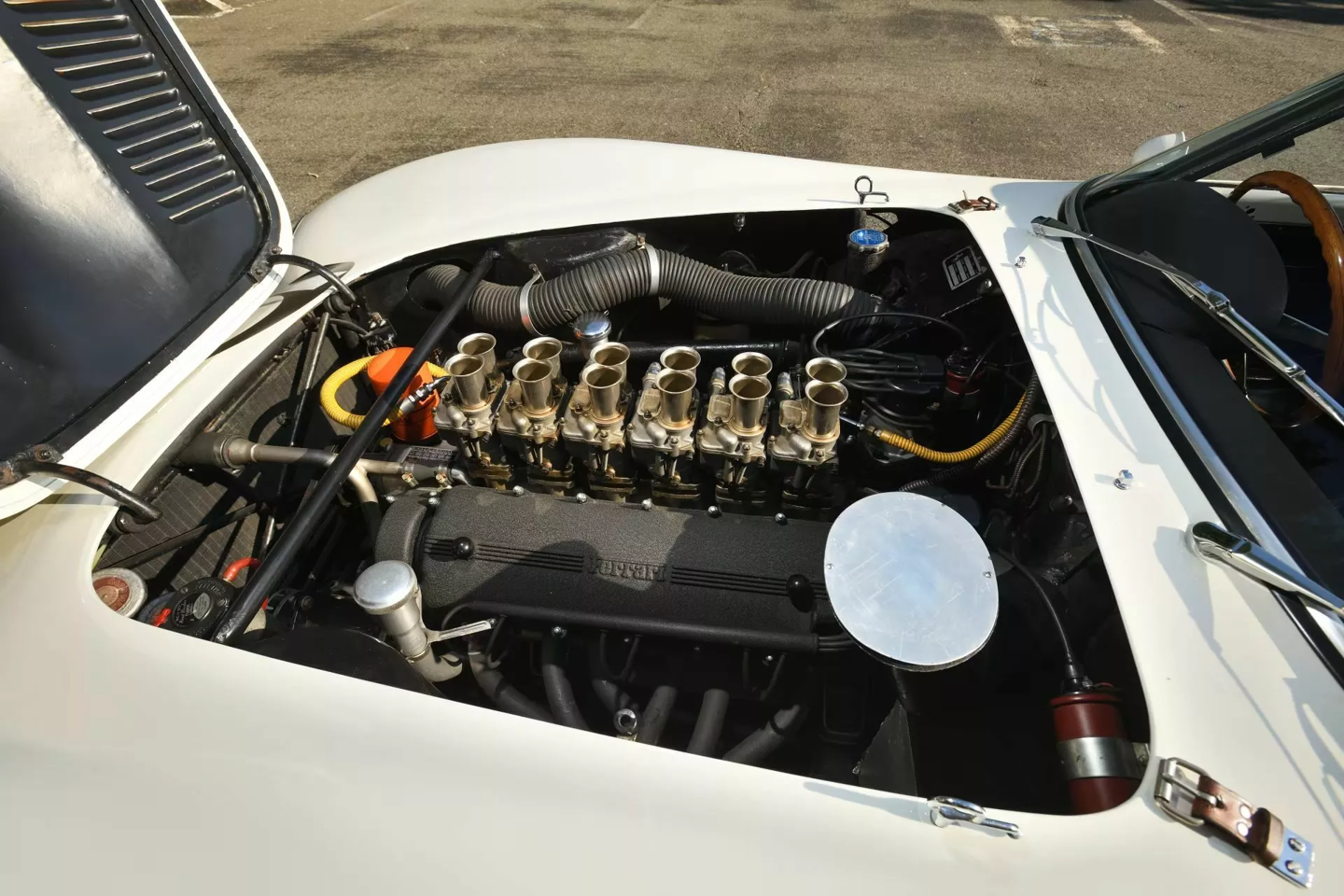 值得一提的是,此次拍卖不仅包含车辆本身,还附带一套极其珍贵的原厂赛车备件库,其中包括一台完整的备用 V12 引擎、额外的轮毂、制动系统以及双 Marelli 分电器等。车辆保留了原始的五速手动变速箱和六个 Weber 化油器,机械状态堪称完美。