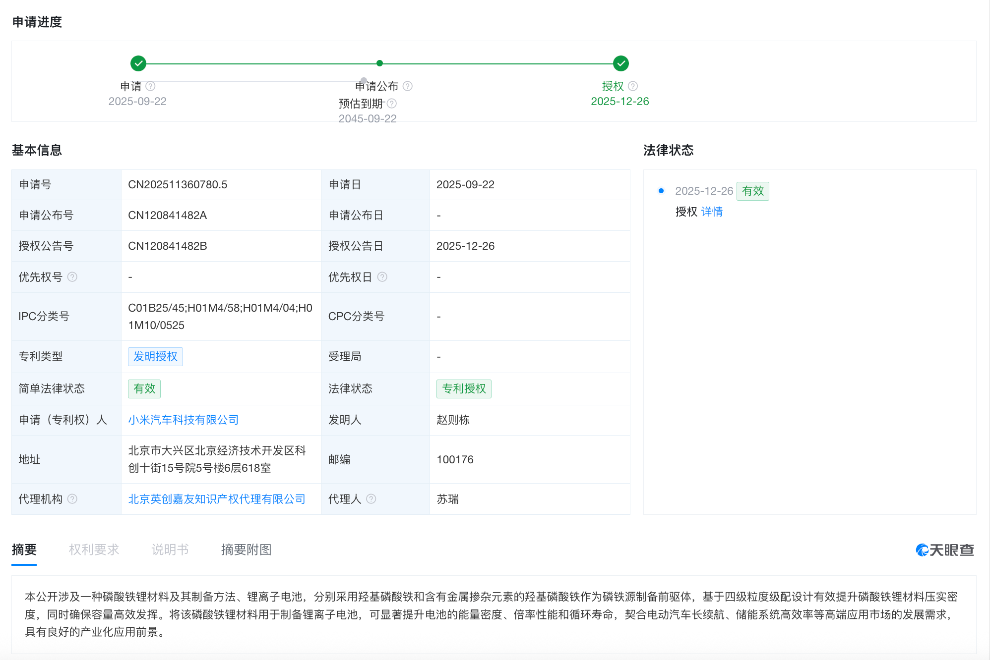 凤凰网科技讯 12月29日,天眼查显示,近日,小米汽车科技有限公司申请的“磷酸铁锂材料及其制备方法、锂离子电池”专利获授权。