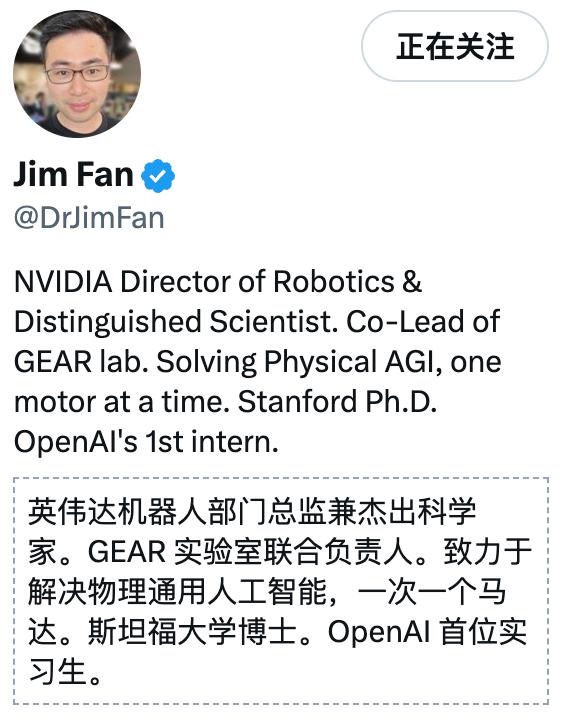 从Jim Fan的介绍来看,他和马斯克关系匪浅,不仅是OpenAI是第一位实习生,现在还是英伟达机器人部门总监兼杰出科学家。