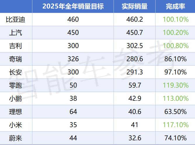 而最终完成年销目标的有6家,分别是比亚迪、上汽、吉利、零跑、小鹏、小米汽车。