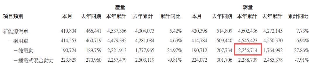 其中,纯电车型全年销量为225.7万辆,同比大涨27.9%,占总销量比重的49%,接近一半。
