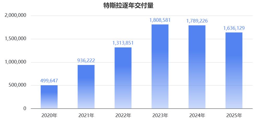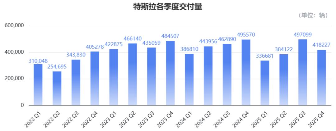 2025年第四季度,特斯拉交付了418227辆车,同比下滑16%;其中包括406585辆Model 3/Y,以及11642辆其他车型。