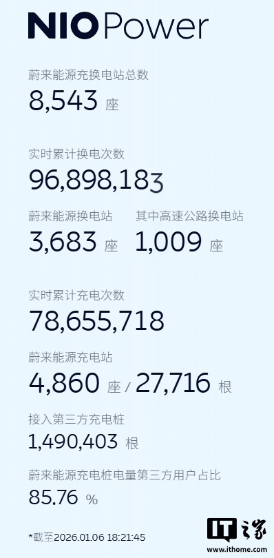 截至IT之家发文,蔚来换电站数量达 3683 座、充电桩数量达 4860 座。