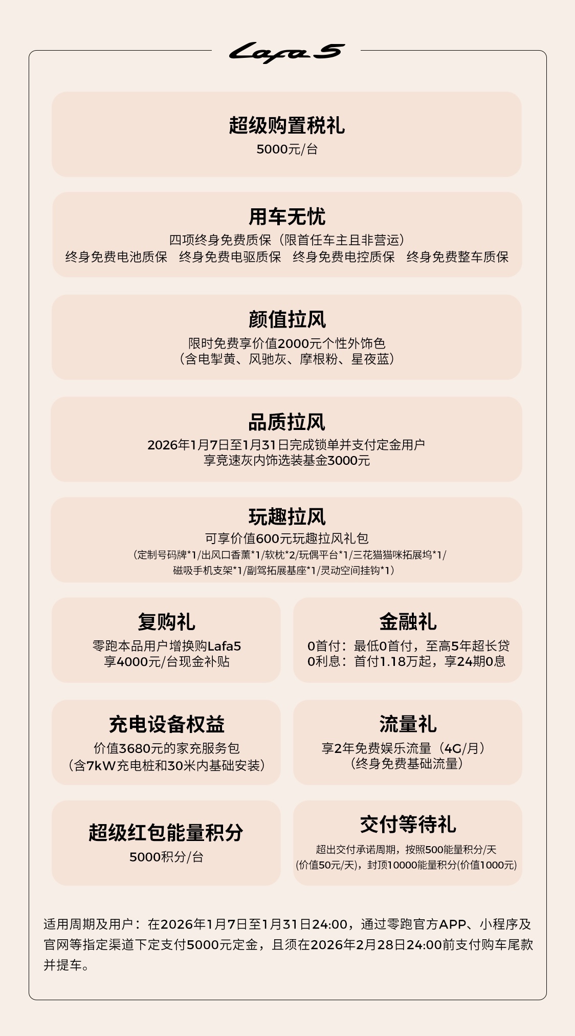 即日起到 2026 年 1 月 31 日 24:00 期间,支付 5000 元定金定购零跑 Lafa5 并在 2026 年 2 月 28 日 24:00 前提车的用户可享 5000 元 / 辆超级购置税补贴、零跑本品用户增换购 4000 元 / 辆现金补贴、0 首付 / 0 利息金融礼、竞速灰内饰选装基金 3000 元、价值 2000 元个性外饰色免费选装、价值 600 元玩趣拉风礼包、超级红包能量积分 5000 积分 / 辆、价值 3680 元家充服务包(含 7 千瓦充电桩和 30 米内基础安装)、2 年免费娱乐流量(4G / 月,基础流量终身免费)、首任非营运车主四项终身免费质保以及交付等待礼等。
